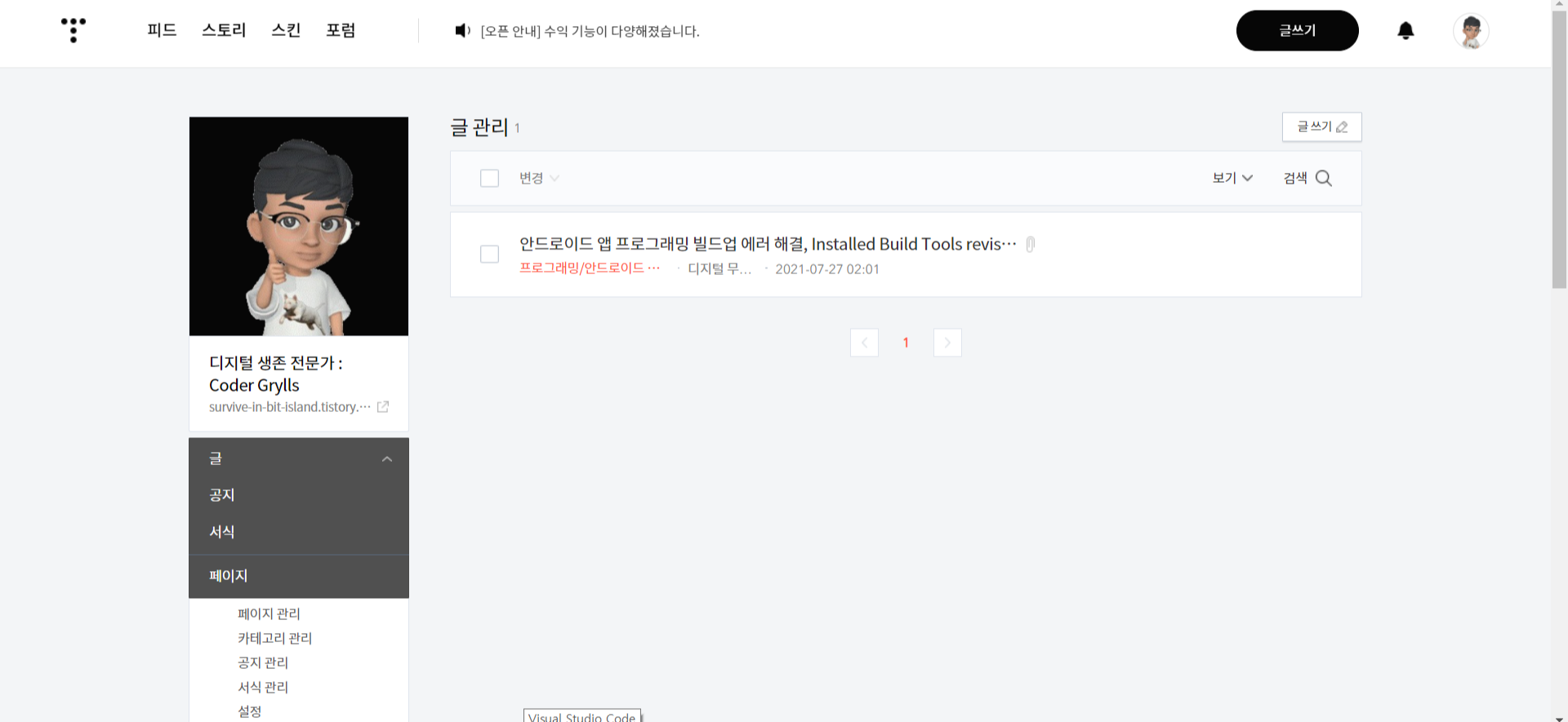 자신의 티스토리 블로그 주소 뒤에 /manage 를 붙여서 이동합니다.